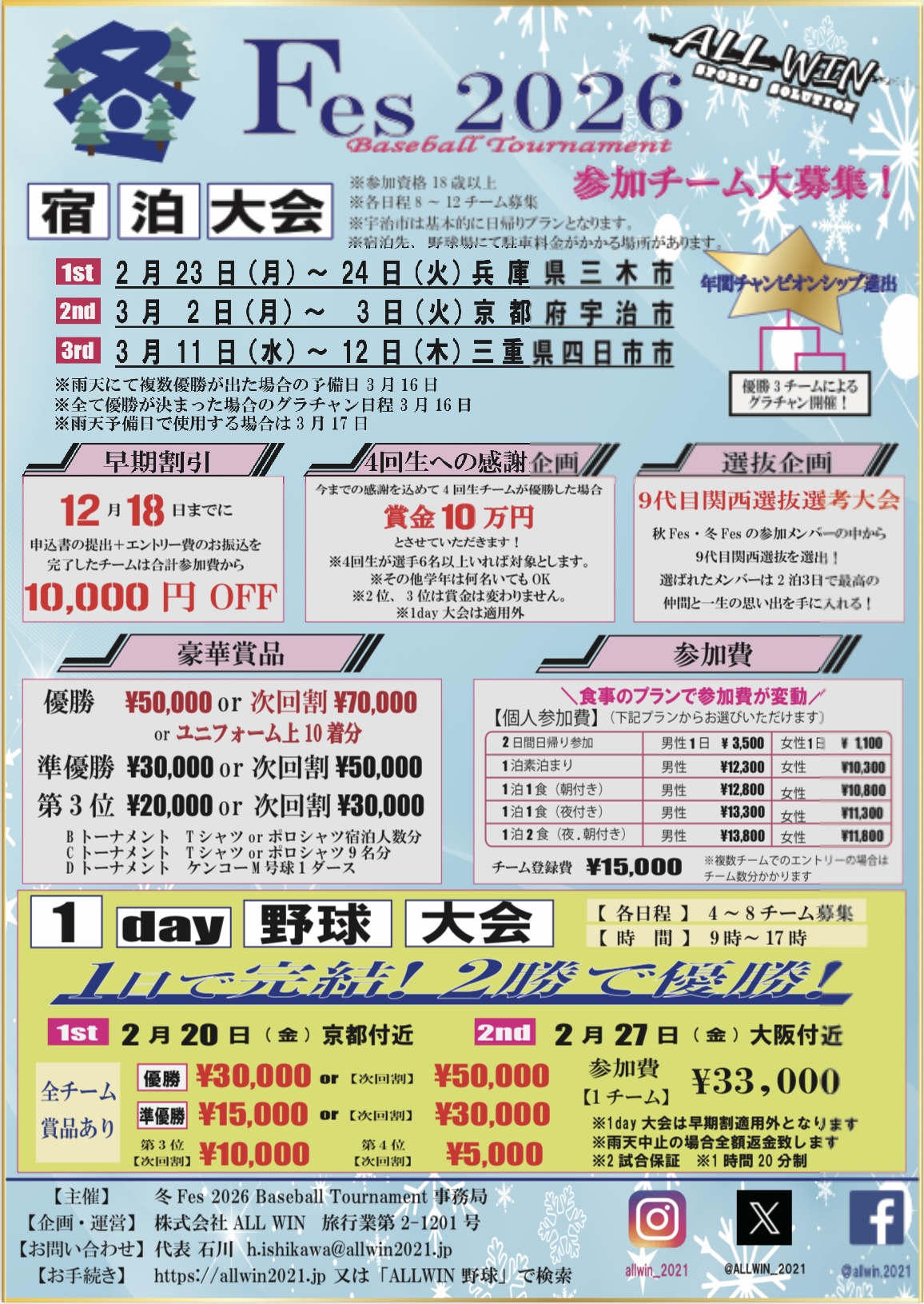 冬Fes大会の募集がスタート🙋♂️ 魅力① ✨豪華賞品✨ 魅力② ✨選べる参加プラン✨ 魅力③ ✨早期特典✨ 魅力④ ✨早期特典第2弾✨ ご参加に興味のあるチームさんはお気軽にお問合せ下さい!!